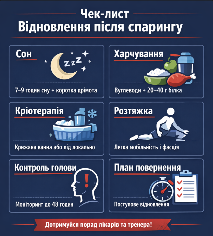 Після жорстких раундів тіло входить у стан гострого стресу з мікропошкодженнями м’язів, змінами в нервовій системі та коливаннями гормонів. Щоб не провалюватися в хронічну втому і не тягнути травми з тренування на тренування, важливо мати простий, перевірений протокол на перші три доби. Цей матеріал зібрано у форматі практичних кроків, що допомагають швидко зняти набряк і забитість, зберегти техніку та безпечно повернутися до інтенсивної роботи на тижневому горизонті.